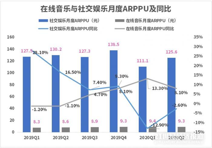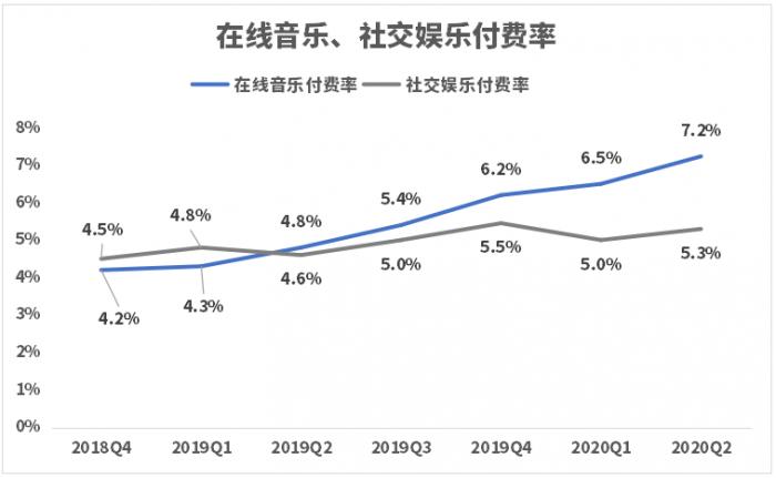 再来看付费率的变化,付费率的分母是MAU,分子是付费用户。由于腾讯音乐二季度MAU的下滑,同时付费数量增长,使得腾讯音乐的付费率在二季度上升。其中,在线音乐的用户增长更快,付费率从一季度的6.5%上升至7.2%,社交娱乐的付费率也上涨至5.3%。