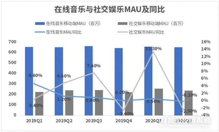 虽然收入利润实现增长,但是互联网红利逐渐消失,流量遭遇天花板这一事实并没有改变,即便是腾讯音乐,获取流量也是越来越艰难。这点可以从两大业务的MAU(月活跃用户数量)情况看出。