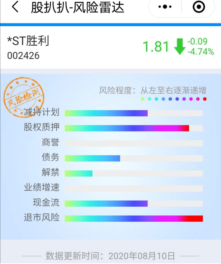 其实,对于胜利精密个股风险,我们可以用专业的风险排除工具,股扒扒小程序来看一下。比如输入002426,就可以看到胜利精密相关信息。