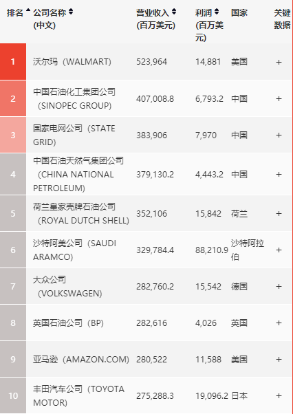 新品略通读了2020年《财富》世界500强排行榜,除了前五名外,从第五名到第十名依次为沙特阿美、大众公司、英国石油、亚马逊、丰田公司。