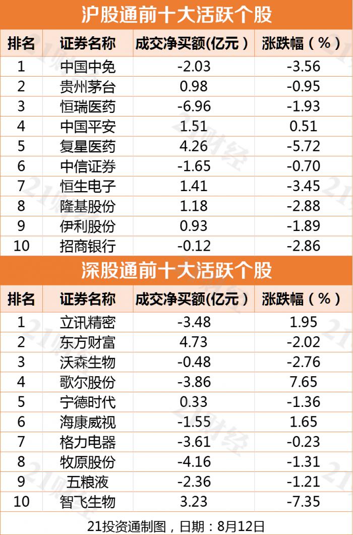 东方财富(300059)、复星医药(600196)、智飞生物(300122.SZ)净买入居前,分别被净买入4.3亿元、4.26元、3.23亿元。