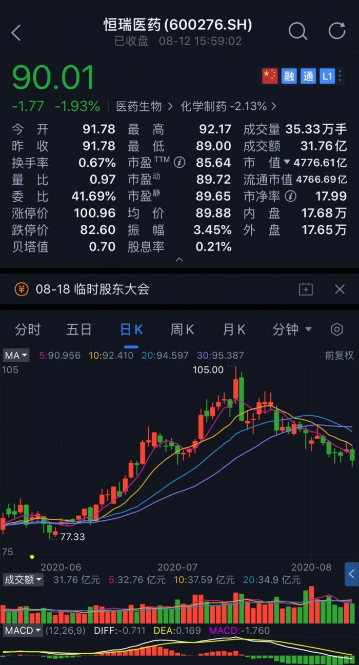 对此,恒瑞医药董秘刘笑含在中报业绩交流会上表示,“上半年疫情影响还没完全结束,导致业绩增速稍微低了一点。”受半年报业绩影响,恒瑞医药股价有一定跌幅,截止8月12日收盘,其市值为4776.61亿元。