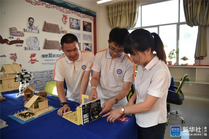 在贵州省黔南布依族苗族自治州长顺县民族高级中学,老师(右)指导学生开展科技活动(7月28日摄)。新华社记者骆飞摄