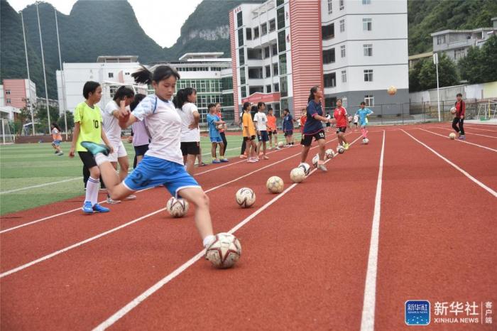 在贵州省黔南布依族苗族自治州长顺县民族高级中学,学生进行足球训练(7月28日摄)。新华社记者骆飞摄