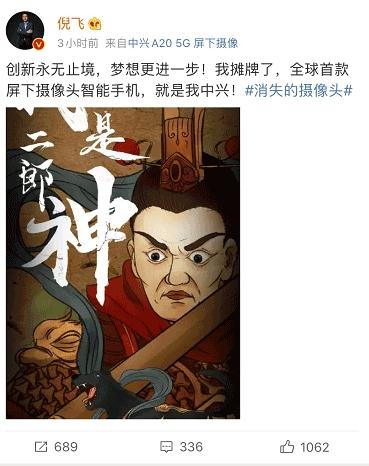 上证报记者了解到,倪飞微博中所指的手机为中兴天机Axon 20 5G,这是全球首款可量产的屏下摄像头手机。中兴通讯将在下周宣布具体的发布时间。