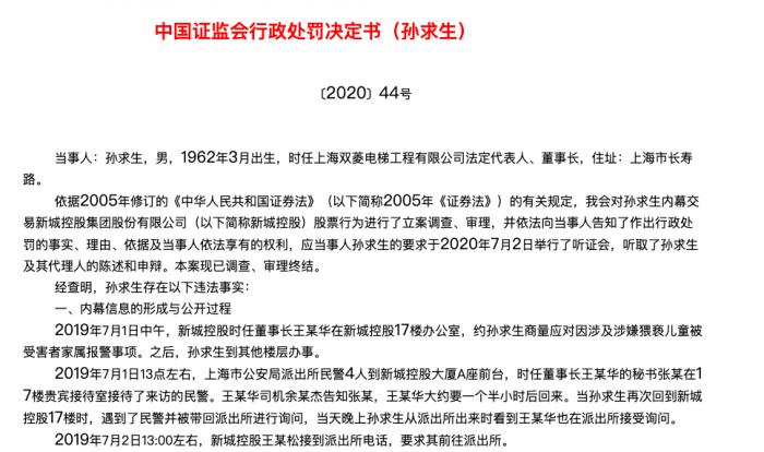 8月4日,证监会最新公布的一份行政处罚决定书显示,王振华好友、时任上海双菱电梯工程有限公司法定代表人、董事长孙求生于2019年7月1日知悉王振涉嫌犯罪的消息之后,7月2日、3日通过本人控制的“孙求生”及其妻子“钱某娟”的证券账户,突击卖出新城控股股票5万股,避损金额合计约65万元。