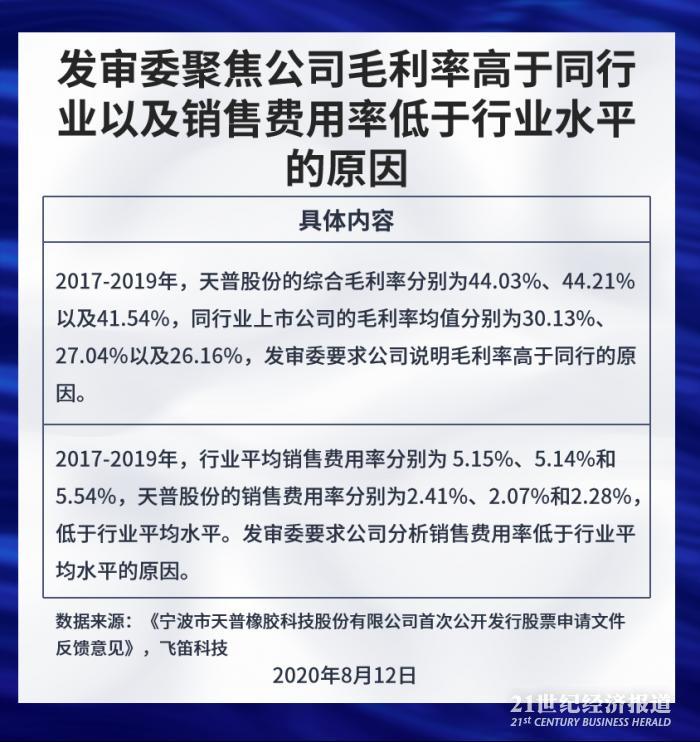 首先是毛利率高于同行业可比公司的原因,2017-2019年,天普股份的综合毛利率分别为44.03%、44.21%以及41.54%,同行业上市公司的毛利率均值分别为30.13%、27.04%以及26.16%,发审委要求公司说明毛利率高于同行的原因。