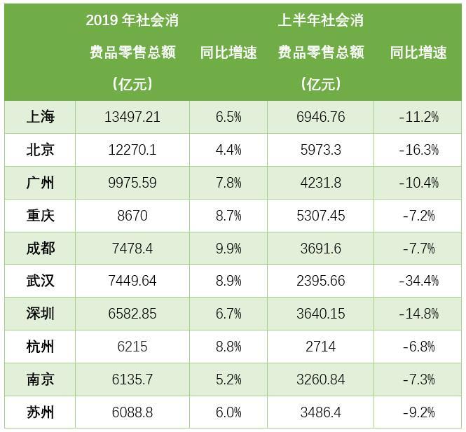 今年上半年,包括深圳、成都、重庆、杭州、苏州、南京等在内的万亿级GDP城市都已经实现了经济正增长,但从消费表现来看,大多数城市的社会消费品零售总额降幅虽然逐月在收窄,但上半年整体仍然出现了大幅负增长,一些城市的表现不尽人意。