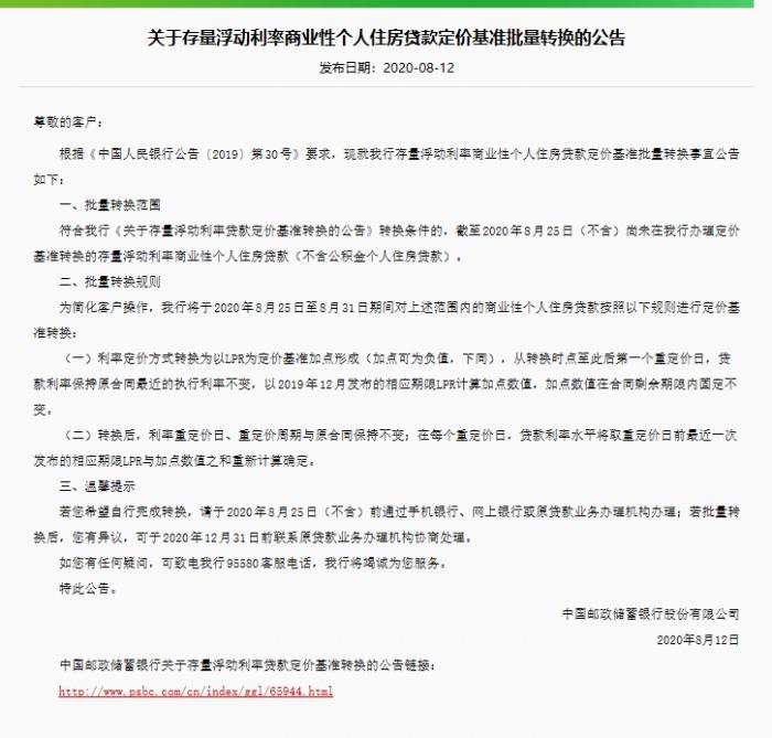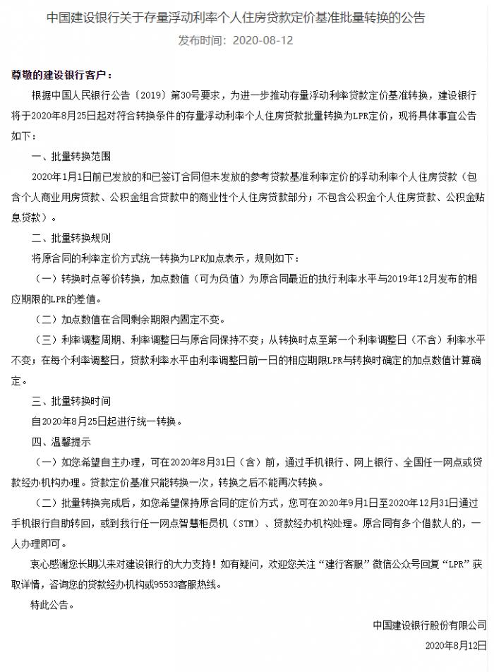 8月12日,工建农中邮储五家国有大行同时发布公告,将于8月25日起对批量转换范围内的个人住房贷款,按照相关规则统一调整为LPR定价方式。贷款定价基准只能转换一次,转换之后不能再次转换。