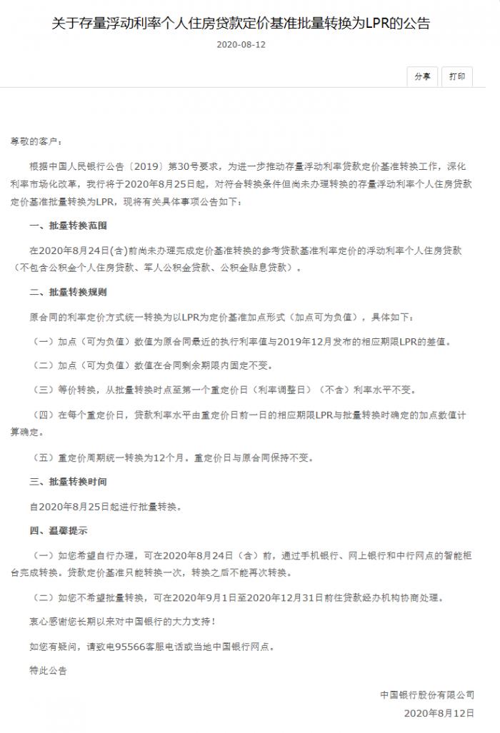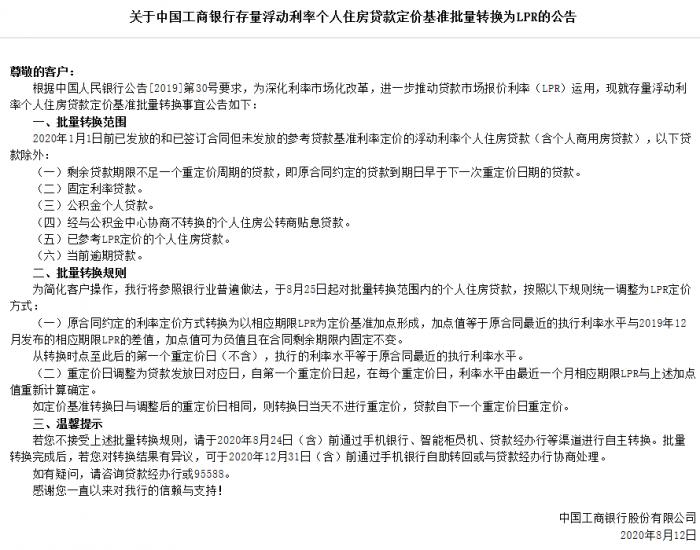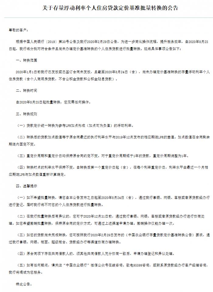 公告同时明确,批量转换完成后,若对转换结果有异议,可于2020年12月31日(含)前通过相关渠道自助转回或与贷款经办行协商处理。