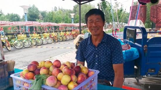 烈日之下,68岁的黄白音础鲁在自家的水果摊前正忙着晃动蒲扇驱赶蝇虫,还时不时的看两眼在观光自行车上酣睡的小孙子。脸上洋溢着幸福笑容的黄白音础鲁,对现在的生活非常满足。见到记者,他说的最多的是,“感谢政府”。