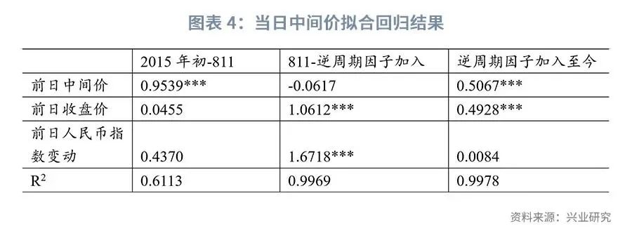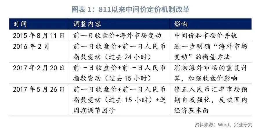 “811”汇改掀起中间价四轮改革。 2015年8月11日央行调整中间价报价机制,要求做市商“参考上日银行间外汇市场收盘汇率以及国际主要货币汇率变化”,在此基础上单日调贬中间价1.9%,单周调贬中间价4.6%,实现了中间价和市场价并轨。其后央行多次修正“海外市场变动”的衡量方法,并于2017年5月26日在中间价定价机制中增加了“逆周期调节因子”。