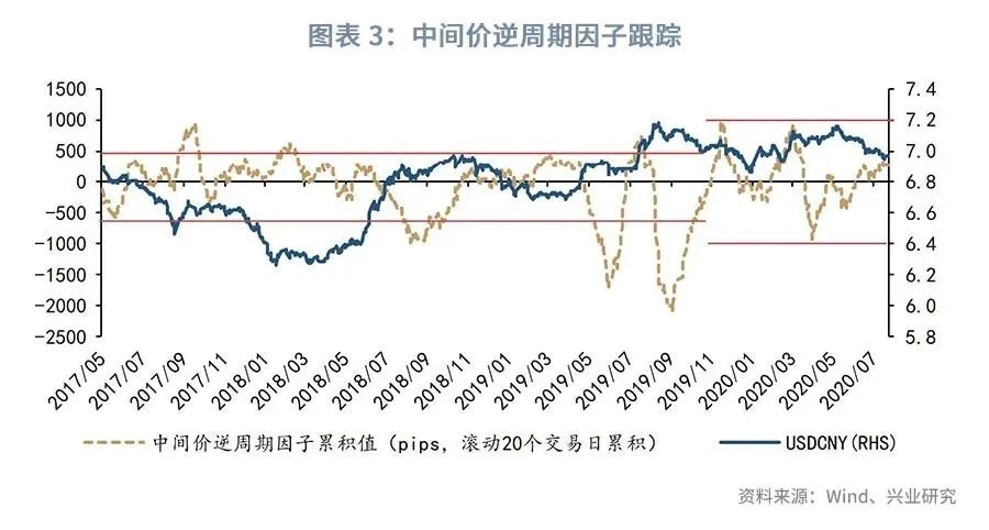 逆周期因子对于预防人民币汇率超调、回归经济基本面具有重要意义。 考虑到中间价“比较多反映与预期方向一致的变化,少反映或不反映与预期方向不一致的基本面变化”,逆周期因子的初衷是修正人民币汇率预期的自我强化,从而将市场供求还原到与经济基本面相符的水平(见图表 2)。