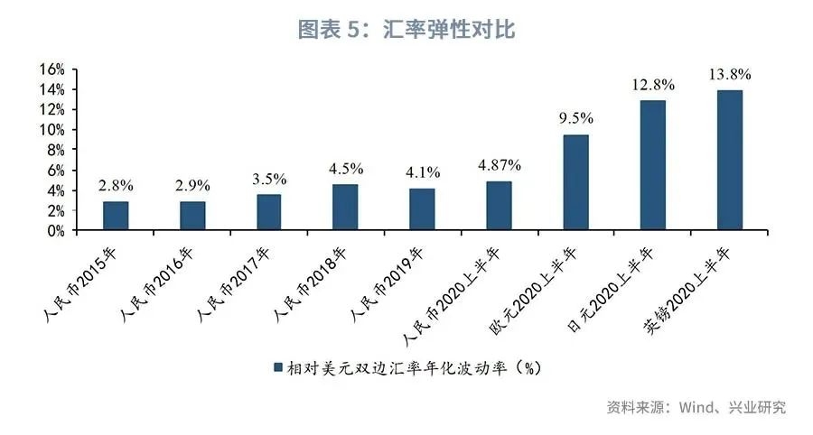 定价机制改革推动汇率弹性不断提升。 从实施效果来看,一方面,811汇改前人民币中间价存在较强的自相关性,而前日收盘价和人民币汇率篮子变动都不构成其定价因子;811汇改后,前日收盘价和篮子变动决定当日中间价变动,且消除了中间价的自相关性;加入逆周期因子后,前日中间价和前日收盘价构成主要定价因子,篮子变动的效果则趋于不显著;总体而言中间价改革的初衷得到有效贯彻(见图表 4)。另一方面,中间价的自相关性减弱后,中间价的变动弹性显著提升,并带动收盘价的汇率年化波动率从2015年的2.8%提升到2020上半年的4.9%,相较自由浮动的经济体货币差距缩小(见图表 5)。
