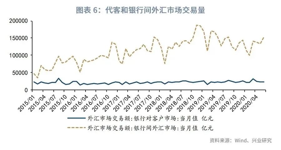 人民币银行间外汇市场成交量取得长足发展,但国际化程度仍有很大提高空间。 按照国际清算银行的统计,2019年4月人民币场外外汇日均成交量为2842亿美元,相较2016年2021亿美元增长41%,尽管如此,人民币成交量仅占场外外汇交易的2.2%;2019年4月中国大陆场外外汇日均成交量为1360亿美元,相较2016年728亿美元增长87%,中国大陆已超过德国,成为全球第8大外汇交易中心。按照外管局的统计,2015年以来代客市场外汇成交额始终维持在2万亿元/月附近,客盘中80%由即期外汇交易构成。银行间市场外汇成交额远大于客盘,半数以上由外汇掉期贡献;2015年以来,银行间市场成交额自5万亿元/月增长到2020年初的14万亿元/月(见图表 6)。