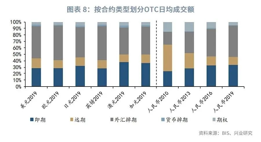 境内外汇市场各品种交易比重趋于合理化。 随着人民币双向波动的特征显性化、升贬行情切换加快、外汇避险的经验和意识不断深入,衍生品交易更加多样化、灵活化。截止2019年4月人民币外汇即期、远期、掉期、期权、货币掉期占比为34%、13%、48%、2%和4.6%,与国际主流货币基本一致。
