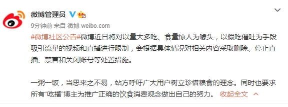 与此同时,据微博管理员8月13日消息,微博近日将对以量大多吃、食量惊人为噱头,以假吃催吐为手段吸引流量的视频和直播进行限制,会根据具体情况对相关内容采取删除、停止直播、禁言和关闭账号等处置措施。