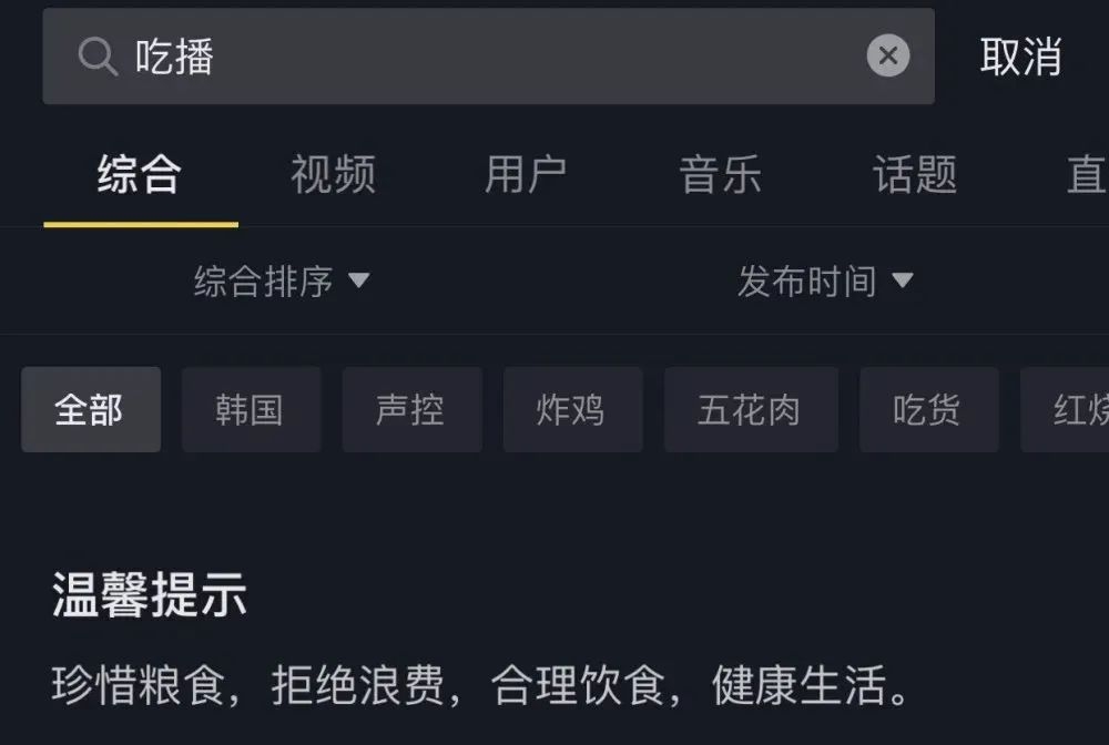 据中国青年报,目前,在一些短视频平台搜索“吃播”、“大胃王”等关键词,会出现“文明吃播,珍惜粮食”等提示。