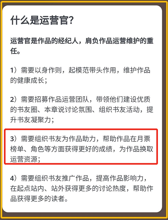 在运营官的解释说明中,最有饭圈味的当属第三条:组织书友为作品助力,帮助作品在月票榜、角色等方面获得好成绩,换取运营资源。