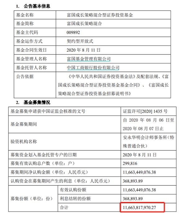 如8月11日成立的富国成长策略混合基金,募集就达到116.64亿元。