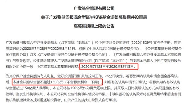 据该基金公告显示,广发稳健回报混合型基金原定募集时间为2020年7月28日至2020年8月31日,后将基金募集期限调整为2020年7月28日至2020年8月13日。同时规定,该基金认购总金额不超过150亿元(不含募集利息)。