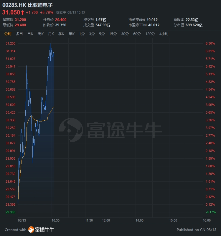富途资讯13日消息,比亚迪电子股价一度涨逾6%,现涨5.79%报31.05港元。