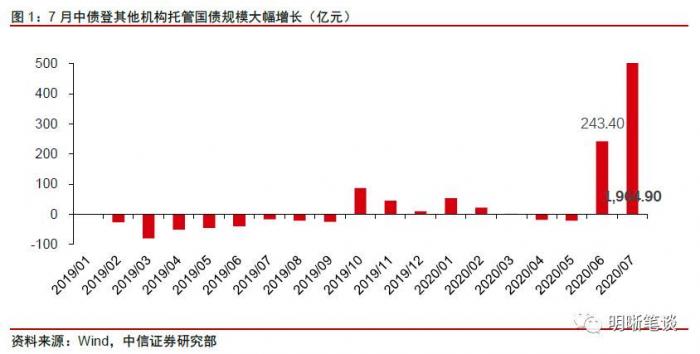 今年7月,近万亿特别国债密集发行。根据中债登近日公布的债券托管数据,“其它”类机构7月记账式国债托管量大幅增加1964.9亿至1.79万亿,远超历史水平,引发市场对中国央行在二级市场购买国债的猜测。