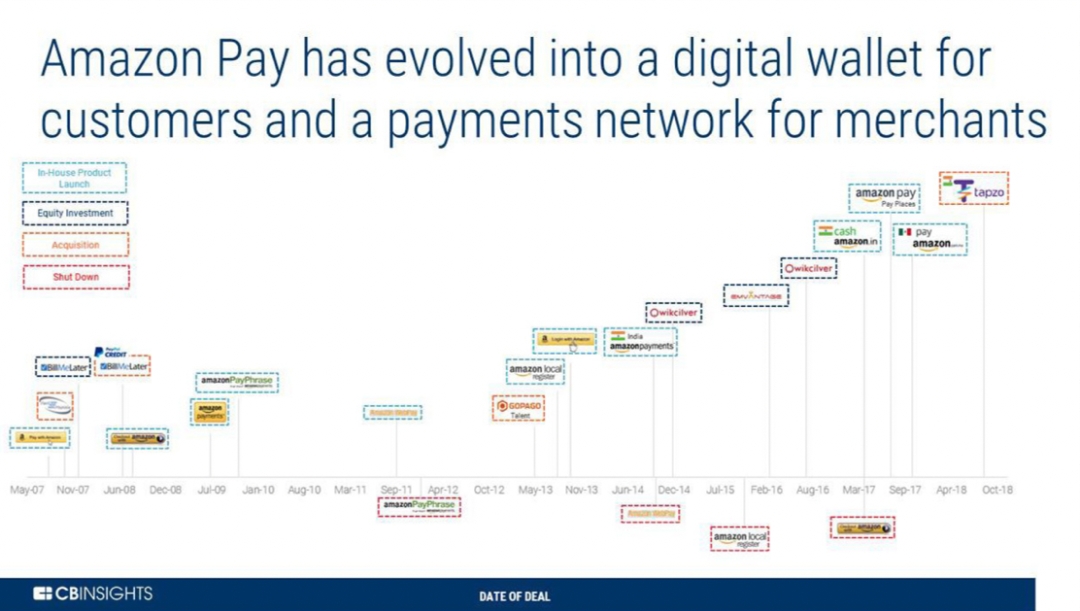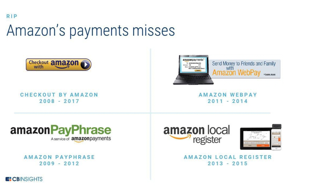 2007年,亚马逊推出了第一款知名的支付产品,即Pay with Amazon。同年,该公司收购了TextPayMe, 针对点对点 (P2P) 的移动服务,2011年,其重新启动改名为Amazon Webpay。但Webpay未能获得用户青睐,于2014年暂停服务。彼时认为,亚马逊布局P2P付款或为时过早。