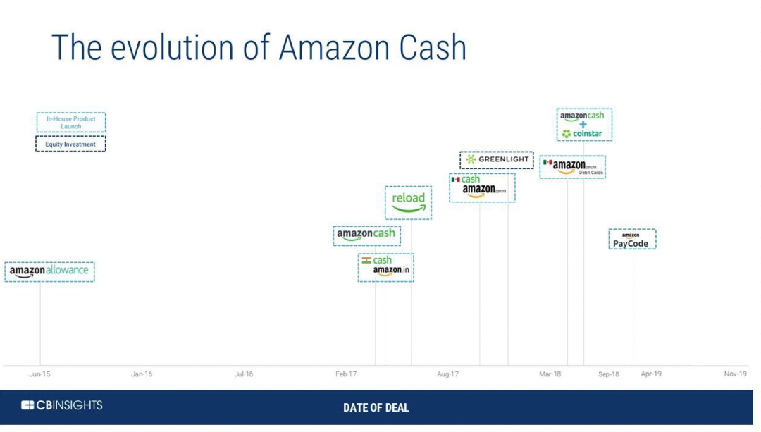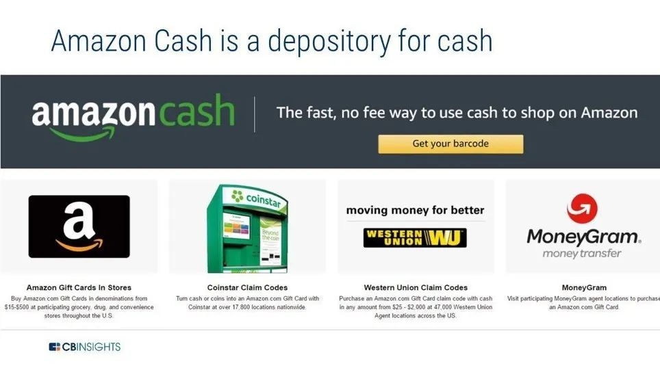 自Amazon Cash推出以来,Amazon进行了一些关键产品的开发:2018年5月,Amazon Cash扩展了与Coinstar的合作伙伴关系,允许客户从Coinstar终端存入零钱,并使用Amazon Cash应用程序以数字方式兑现,而不是现金或实物礼品卡。Coinstar拥有近2万个商户或金融机构的自助服务终端,与Coinstar合作有利于将亚马逊服务拓展到终端。