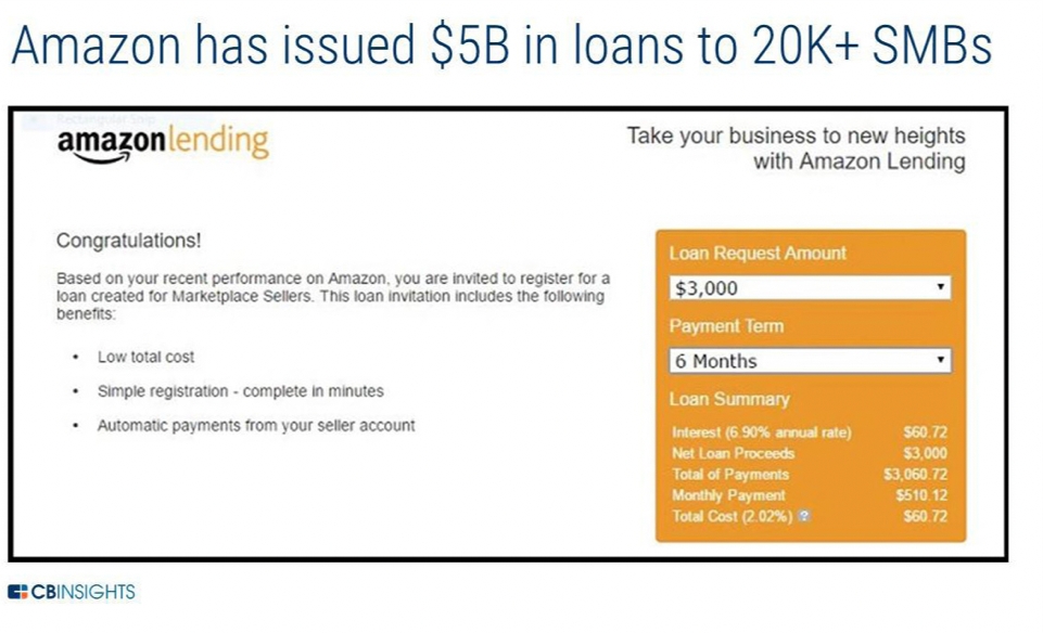 2011年,亚马逊借贷启动,旨在帮助小型企业在亚马逊上融资和销售更多商品。2018年,亚马逊借贷与美国银行美林银行合作,在受邀范围内发行贷款,金额在1000美元至75万美元之间。2020年,亚马逊与美国的高盛和德国的ING建立了类似的合作伙伴关系。在与高盛(Goldman Sachs)Marcus品牌合作中,该银行将邀请部分商家申请最高100万美元的信贷额度,条件是亚马逊向第三方金融机构开放其卖方销售数据宝库。亚马逊和ING的合作中,中小企业贷款范畴为1.13万美元至85.23万美元。