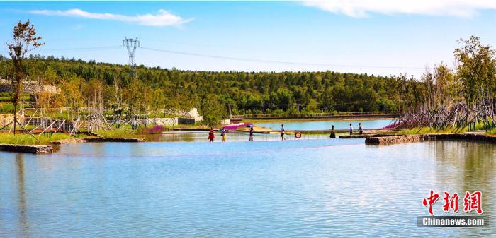 乌兰浩特市天骏山,蓝天白云倒映湖面,四周格桑花海迎风摇曳。谁也想不到,多年前这里竟是一个连杂草都没多少的废弃采石场。