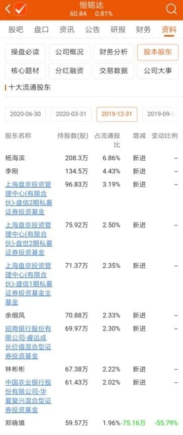 2019年12月,睿远基金杨维舟曾前往调研,2019年年末,睿远成长价值成为恒铭达新进前十大流通股东。