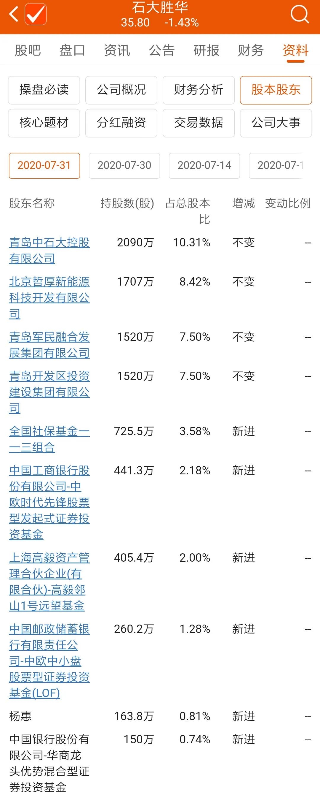 8月4日,石大胜华关于公司无控股股东及无实际控制人的提示性公告,也透露出机构最新持股情况。