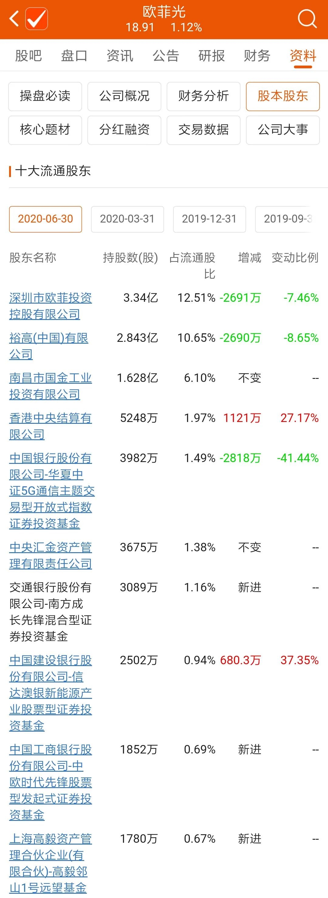 截至二季度末,中欧时代先锋持有欧菲光1852万股,成为新进前十大流通股东,高毅邻山1号远望基金持有1780万股,也是新进前十大流通股东。此外,南方成长先锋持有欧菲光3089万股,同为新进前十大流通股东。