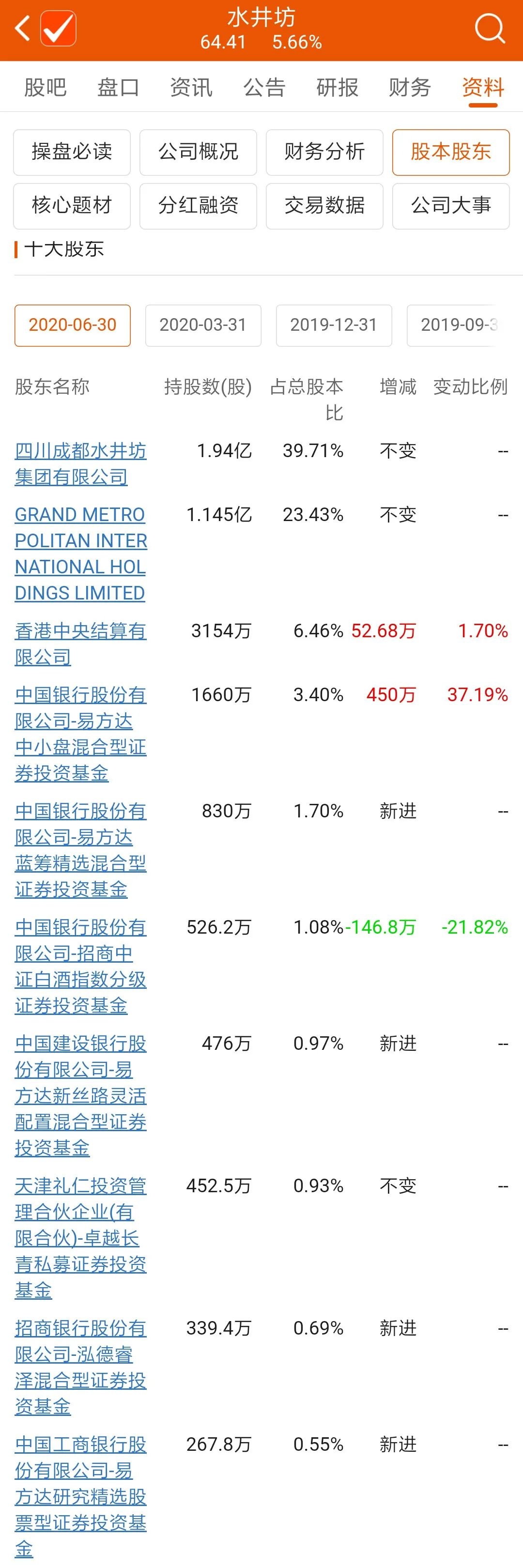 此外,张坤的同事冯波管理的易方达研究精选也进入了水井坊的前十大股东名单,持股数为267.8万股。高瓴资本旗下的礼仁投资-卓越长青私募基金亦是前十大股东。