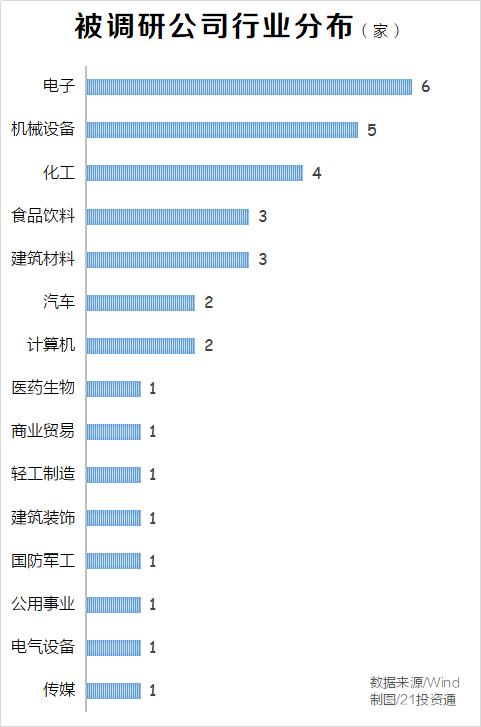从行业分布来看,电子行业最受机构青睐,圣邦股份(300661.SZ)、海康威视(002415.SZ)、晶方科技(603005.SH)等6家相关公司被调研,其次是机械设备、化工行业,分别有5家和4家公司获调研。