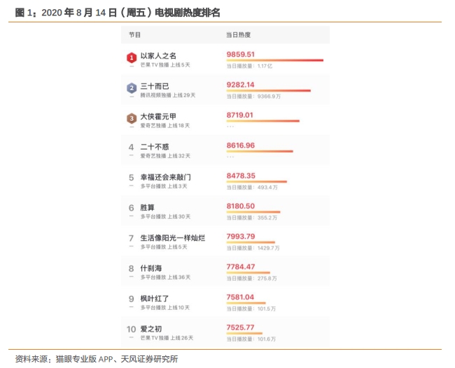根据猫眼数据,2020年8月14日(周五)电视剧热度排行前三分别为:由华策影业、北京老有影视、张新成工作室、北京幸韵文化出品的《以家人之名》排名第一;由柠萌影视、腾讯科技、上海文化出品的《三十而已》排名第二;由中央电视台、爱奇艺出品的《大侠霍元甲》排名第三。