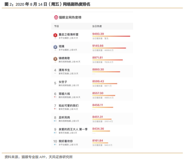 根据猫眼数据,2020年8月14日(周五)网络剧热度前三分别为:由爱奇艺、浙江天猫、南派泛娱、霍尔果斯南派文化出品的《重启之极海听雷》排名第一;由欢瑞世纪、优酷、万达影视、霍尔果斯新媒诚品出品的《琉璃》排名第二;由腾讯影业、上海克顿文化出品的《锦绣南歌》排名第三。