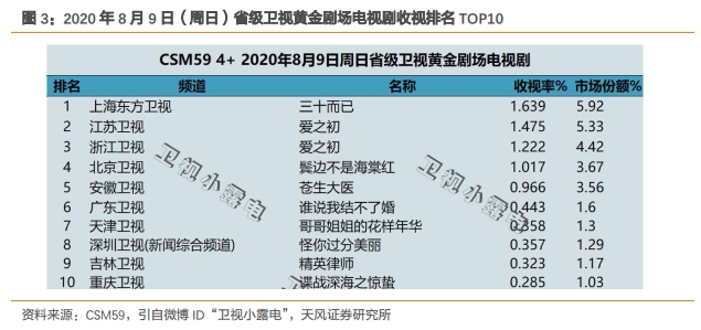 根据微博ID“卫视小露电”提供的数据,2020年8月9日(周日)csm59卫视黄金剧场电视剧收视排名:第一名是由柠萌影视、腾讯科技、上海文化出品的《三十而已》(上海东方卫视1.639%);第二、三名是由印纪影视、上海银润传媒、北京摩尼盛世出品的《爱之初》(江苏卫视1.475%,浙江卫视1.222%)。