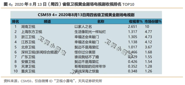 根据微博ID“卫视小露电”提供的数据,2020年8月13日(周四)csm59卫视黄金剧场电视剧收视排名:第一名是由华策影业、北京老有影视、张新成工作室、北京幸韵文化出品的《以家人之名》(湖南卫视2.651%);第二名是由天津天逸盛华文化、上海飞宝文化、捷成中视精彩影视出品的《生活像阳光一样灿烂》(上海东方卫视1.317%);第三名是由文鹏森奥、幸福蓝海、世纪华纳、腾讯影业、冉冉昇起影业、悦虎传媒出品的《幸福还会来敲门》(浙江卫视1.305%)。