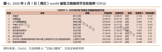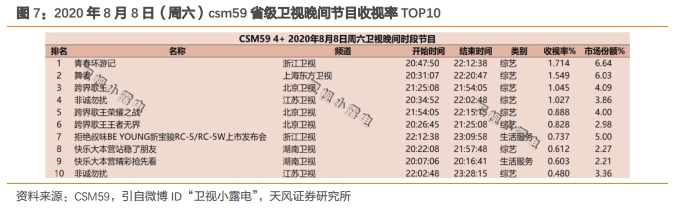2020年8月8日(周六)csm59省级卫视晚间节目收视率前三:《青春环游记》(浙江卫视1.714%)、《舞者》(上海东方卫视1.549%)、《跨界歌王》(北京卫视1.045%)。