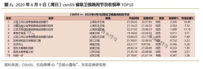 2020年8月9日(周日)csm59省级卫视晚间节目收视率前三:《三区三洲公益季极限挑战宝藏行》(上海东方卫视2.205%)、《三区三洲公益季极限挑战宝藏行前传》(上海东方卫视2.033%)、《三区三洲公益季极限挑战宝藏行后传》(上海东方卫视1.600%)。
