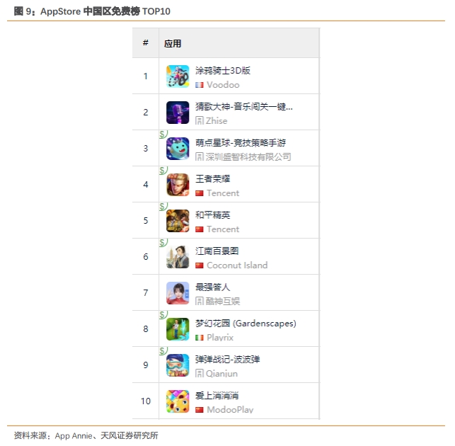 AppStore 2020年8月14日数据中国区免费榜下载量排行前三:Voodoo《涂鸦骑士3D版》、Zhise《猜歌大神-音乐闯关一键猜歌名》、深圳智胜科技《萌点星球-竞技策略手游》;此外,腾讯《王者荣耀》、《和平精英》排名第四、第五,心动公司发行《江南百景图》排名第六。