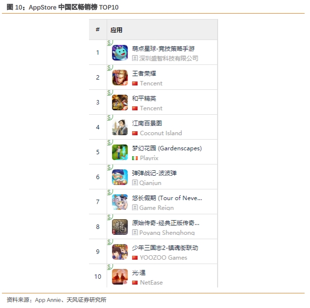AppStore 2020年8月14日数据中国区畅销榜排行前三:深圳智胜科技《萌点星球-竞技策略手游》、腾讯《王者荣耀》、腾讯《和平精英》;此外,心动公司《江南百景图》、游族网络《少年三国志2-镇魂街联动》、网易《光·遇》排名第四、第九、第十。