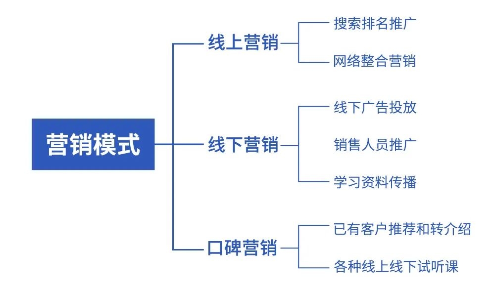 教育营销,本质上也是依据市场需求,通过各种营销策略和营销技巧打动消费者,使其购买教育产品或服务。如果要将教培行业主要营销模式和获客方式进行归类的话,大致可以分为以下几类:线上营销、线下营销和口碑营销,各种营销模式之间并非割裂的关系。仅凭单一模式难以满足获客需要,多数教育企业实施多种营销模式并行的路径。