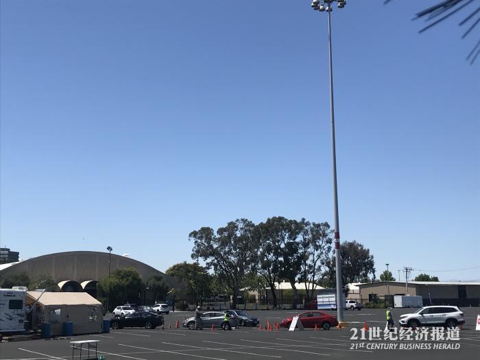 (圣马特奥会议中心排队等候工作人员问询的检测车辆)