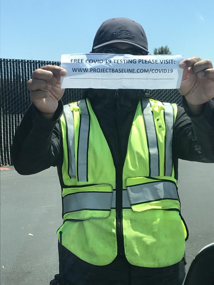 由于检测是免下车(drive-through test)进行,我刚把车开到会议中心门口,就有两位工作人员在此维持车辆的秩序。其中,工作人员A举着一张牌子,上面写着:是否有预约。我刚挥手表示“没有”,A工作人员就上前走到我车窗外,表示“今天500位预约名额已满,但可以上网进行预约。”另一位工作人员B则举着预约网站的牌子,方便我拍下网址。