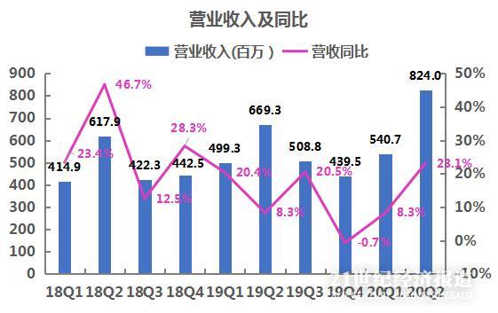 上表是公司2018年以来,单季度收入以及同比增速,从中可以看到,公司的收入在2019年四季度曾经出现负增长,但在今年一季度,在疫情期间,还能录得8.3%的营业收入增长,到二季度,收入同比增速更是恢复到了23.1%,与公司过往的表现相比,是比较高的增速。
