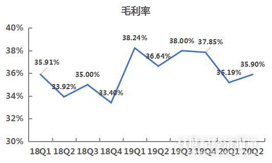 从上图可以看到,公司2020年上半年两个季度的毛利率分别为35.19%和35.9%,跟2019的单季度表现相比,是比较低的水平。