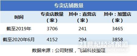 至2020年6月,公司的专卖店数量增加到了4152家,比去年底的3706家增加了12%。